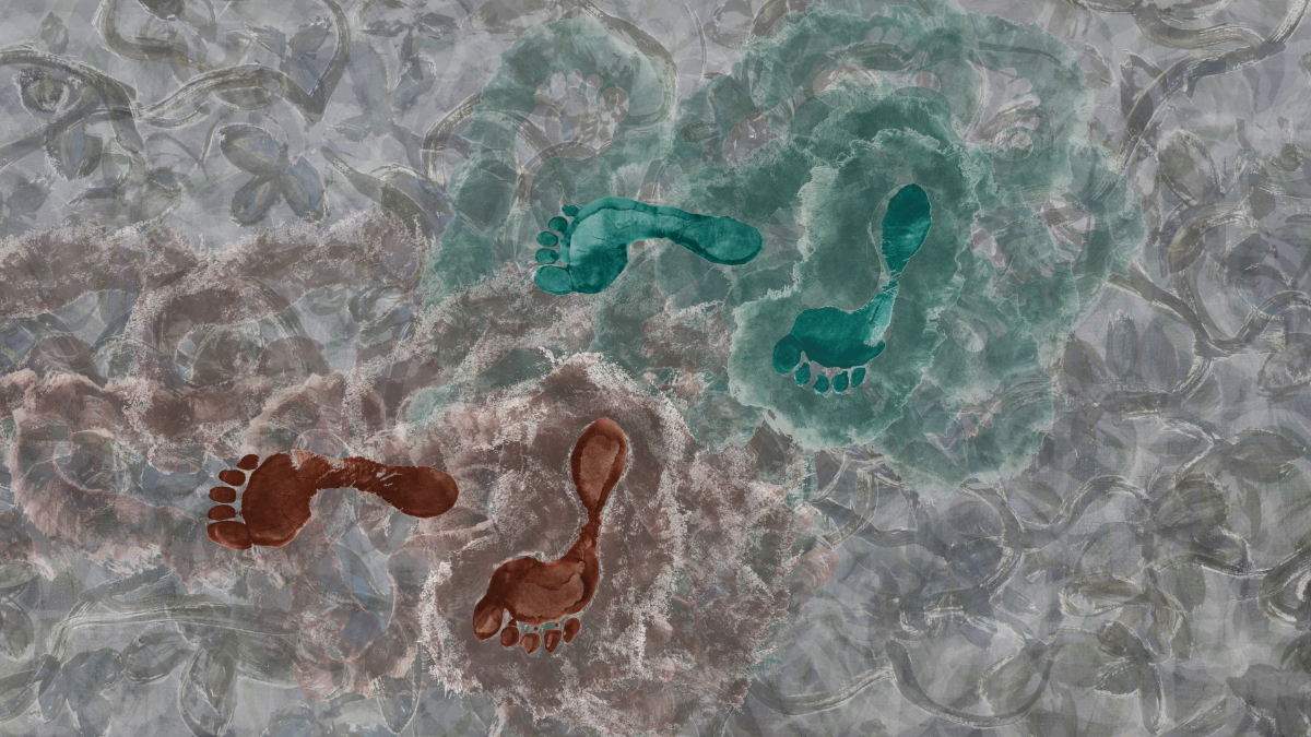 Two pairs of feet move in sync until one pair begins to struggle to keep up with the pace and slowly sinks into another, uncertain world.